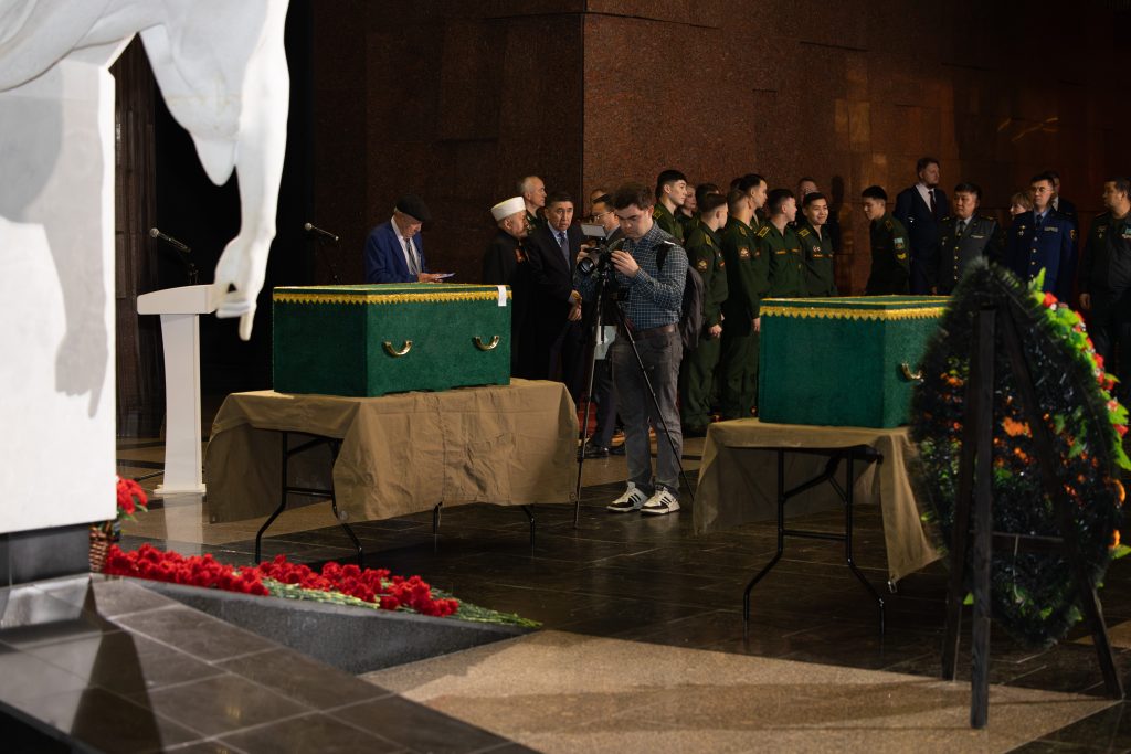 Перед премьерой фильма в Музее Победы прошла траурная церемония по возвращению на родину советских бойцов уроженцев Казахстана героически погибших в ходе Великой Отечественной войны и обнаруженных поисковыми отрядами России в этом году на территории Псковской области.