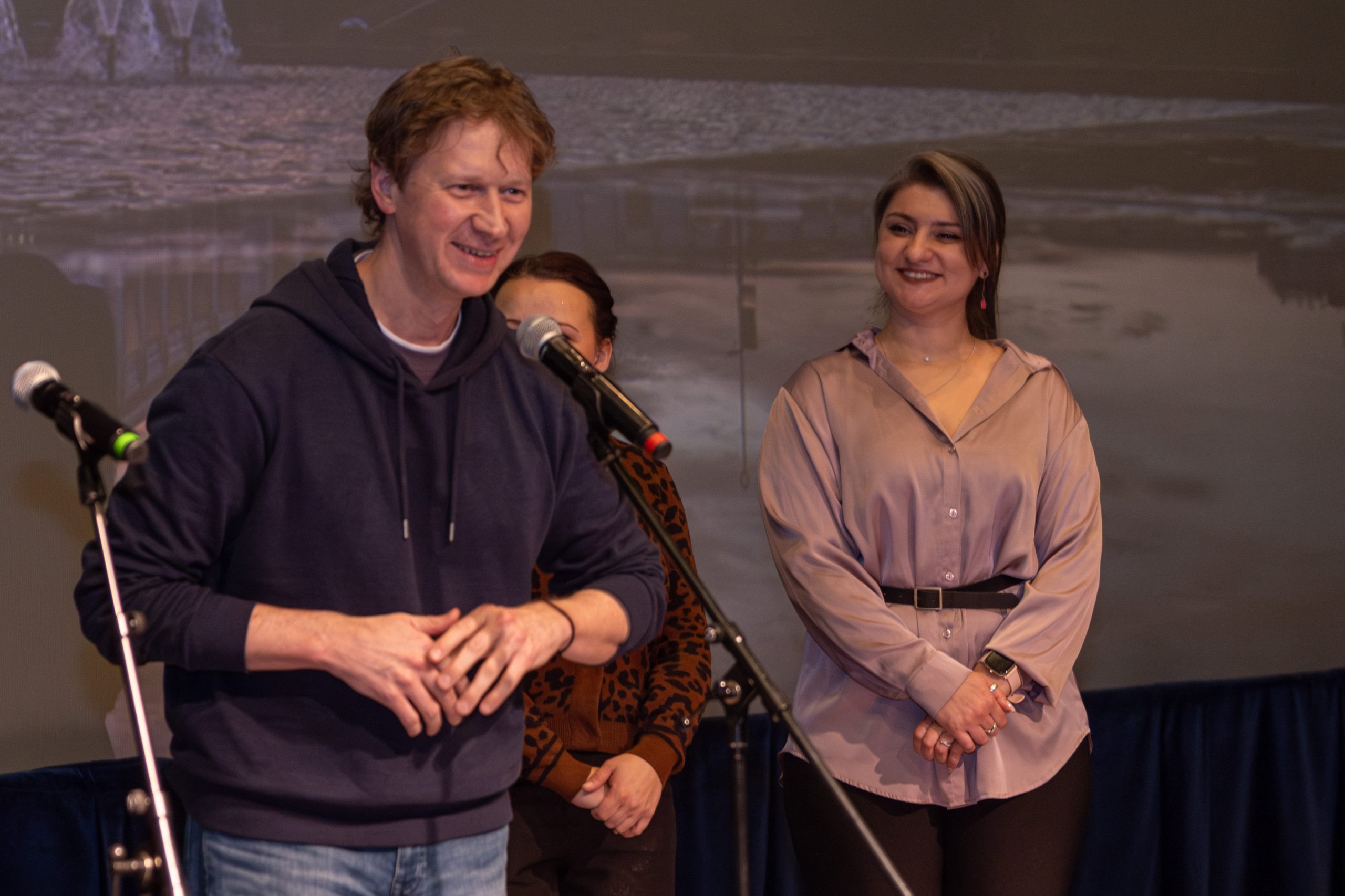 Фильм представили директор отдела корпоративных социальных проектов банка ВТБ Мария Александрович, генеральный продюсер ЧАНО «Языки без границ» и проекта «Диалоги об искусстве. Подкаст для неслышащих» Сергей Кречетов, Переводчик РЖЯ Екатерина Голованова, актрисы театра «Недослов» (Москва) — Ирина Христова (ведущая в кадре) и Дарья Катиди (специалист по жестовой адаптации сценария).